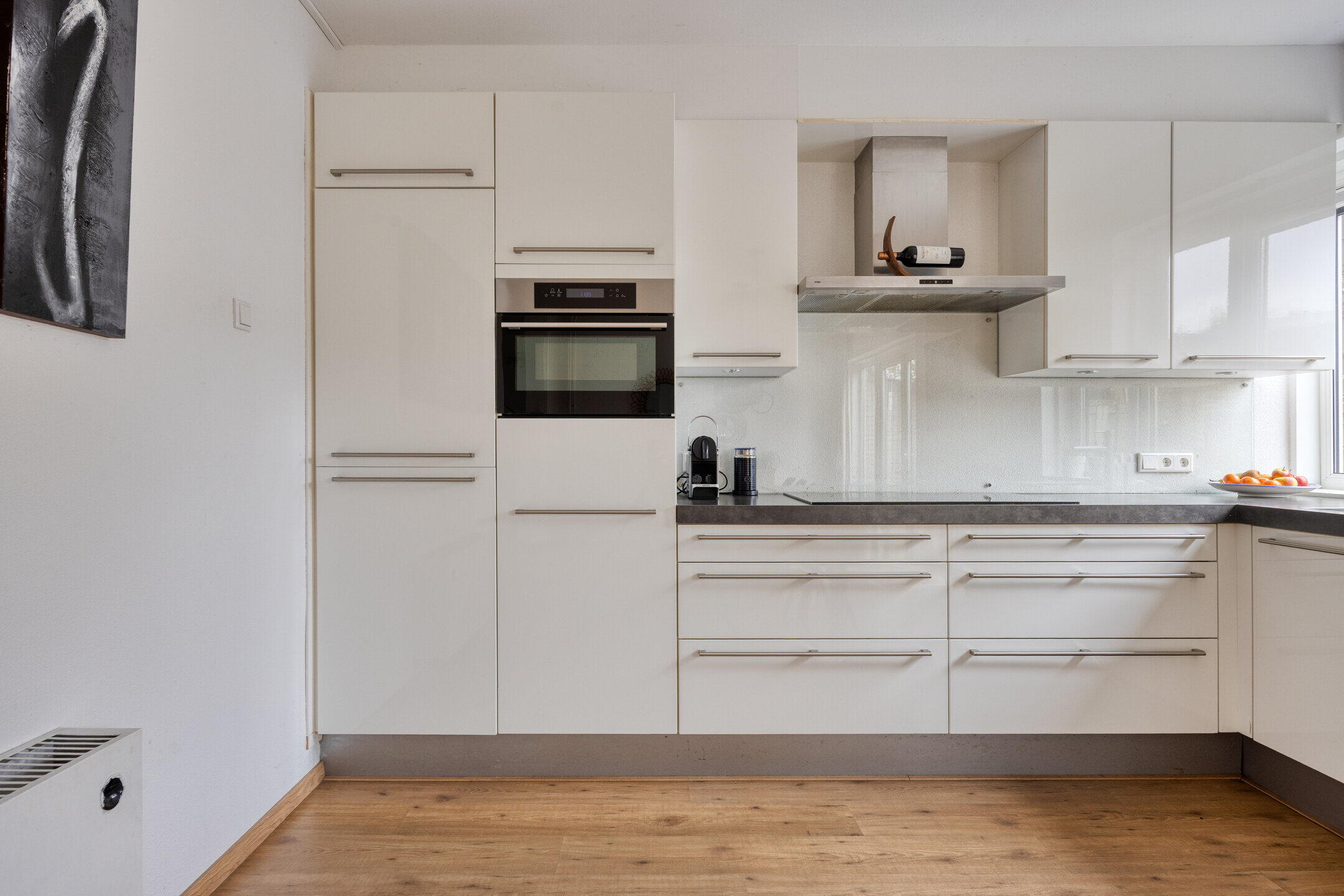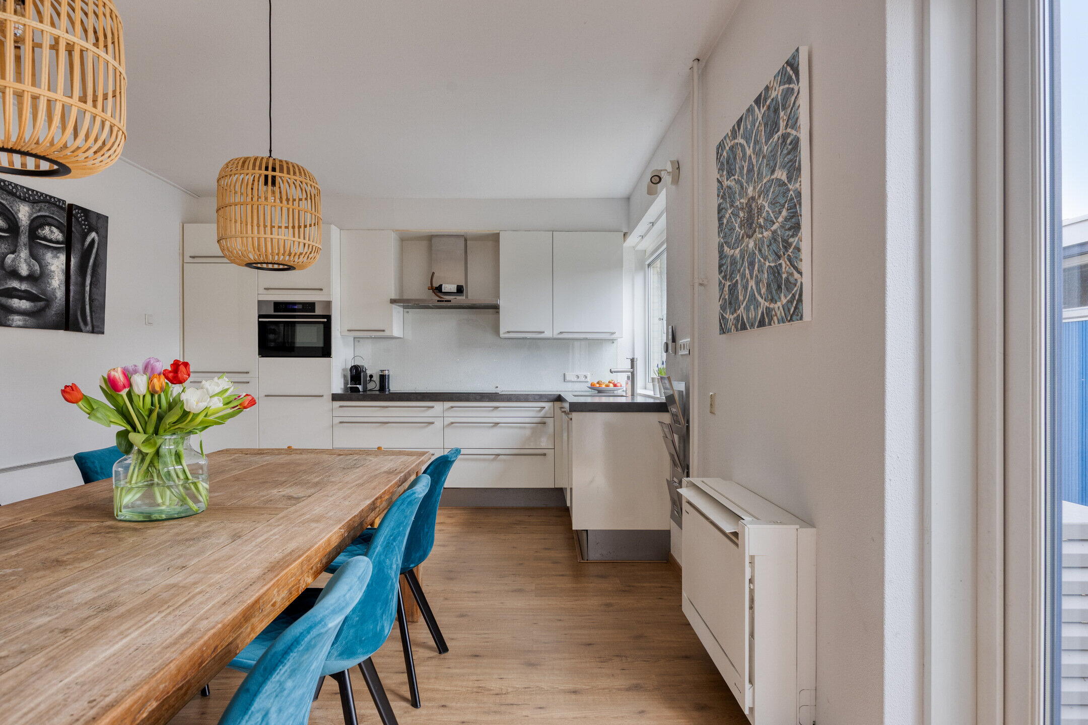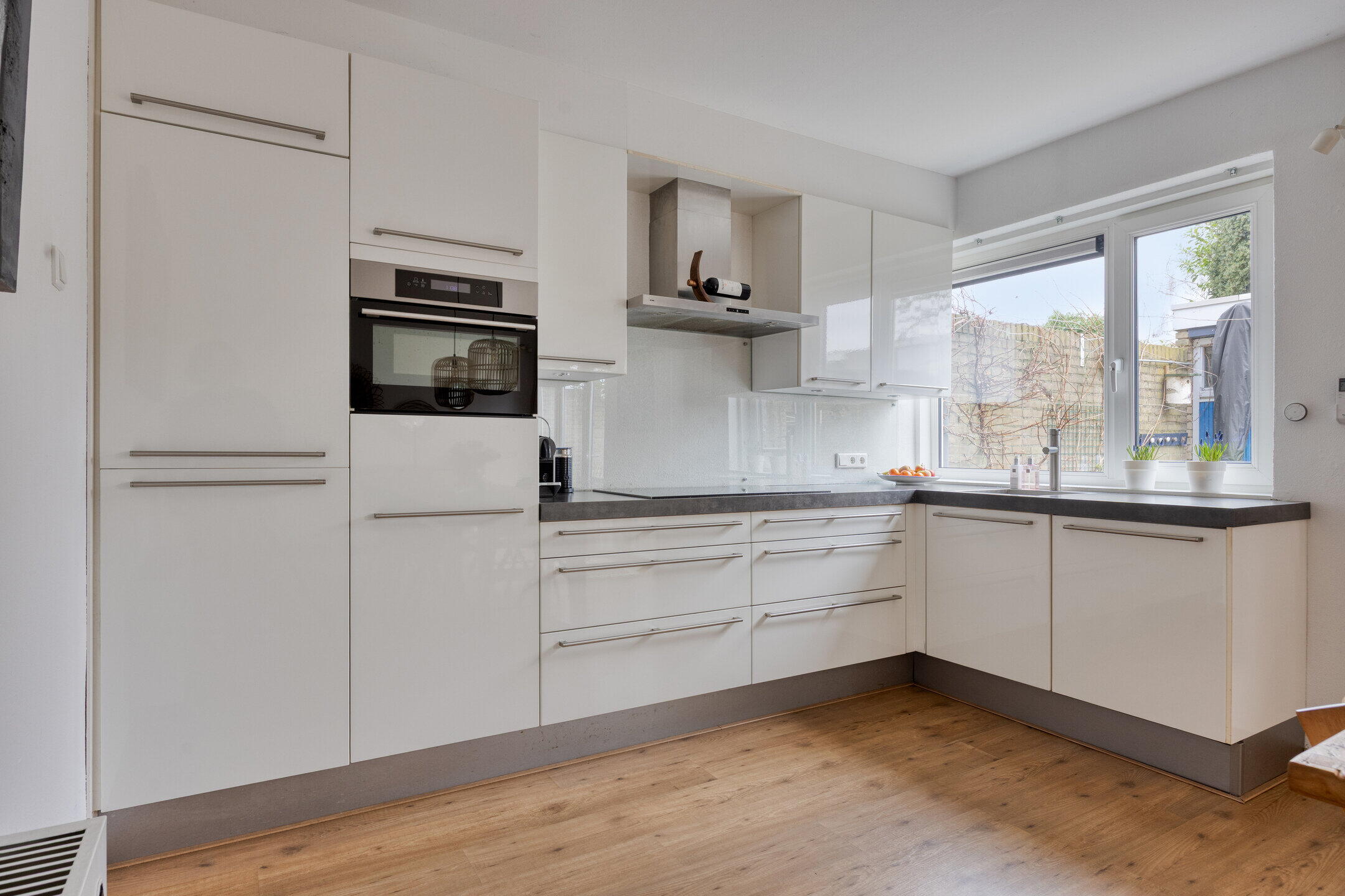 De keuken is uitgevoerd in een nette hoekopstelling en beschikt over diverse inbouwapparatuur, waaronder een vaatwasser, inductiekookplaat, koelkast en oven. Dankzij de royale maatvoering is dit echter méér dan alleen een keuken: hier is sprake van een echte woonkeuken. Er is volop ruimte voor een grote eettafel waar je lang natafelt met vrienden of uitgebreid ontbijt in het weekend. Daarnaast biedt de indeling mogelijkheden voor het realiseren van een kookeiland, waarmee je de ruimte nóg meer tot het hart van de kan maken.