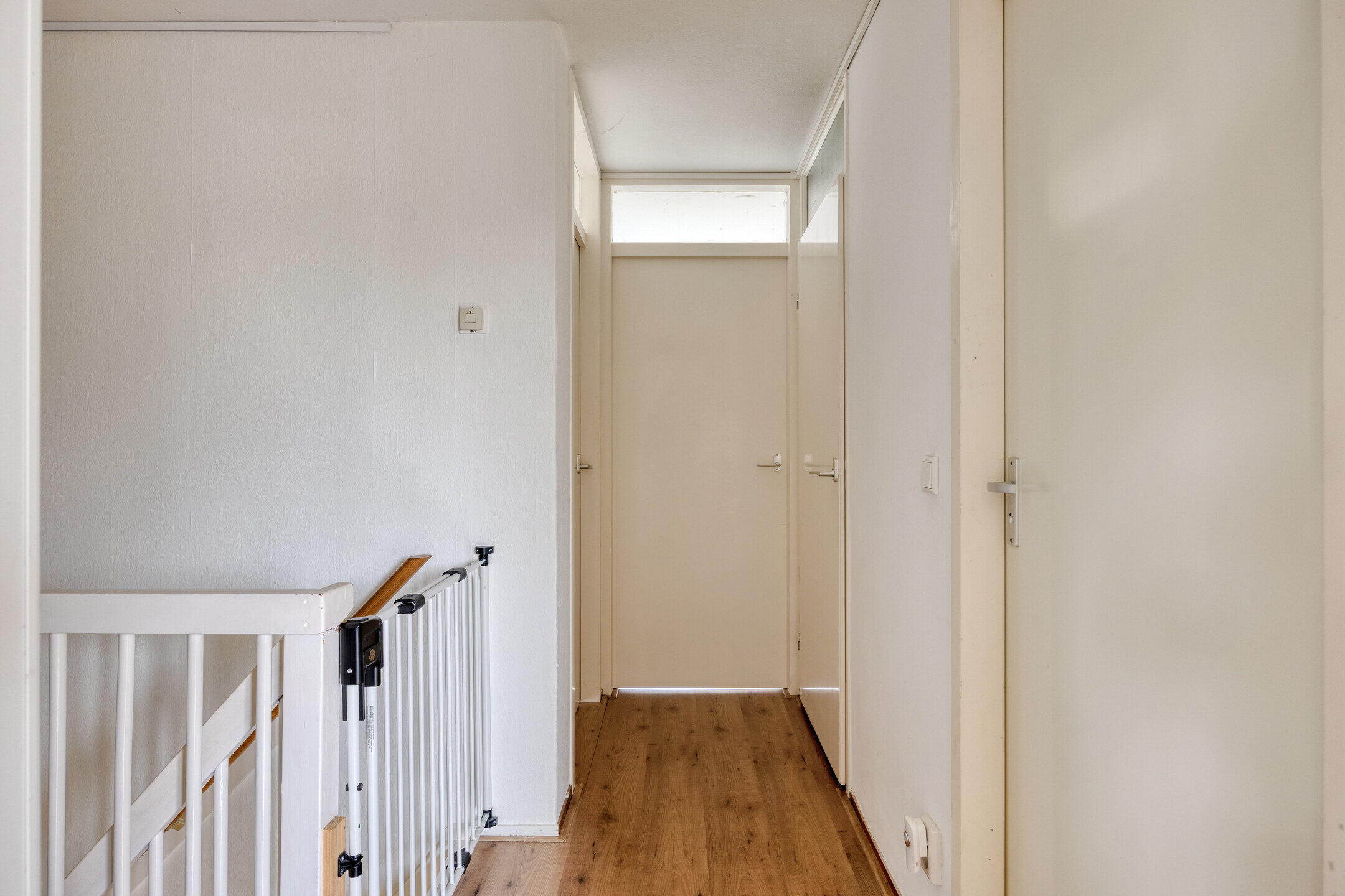 Eerste verdieping: overloop met toegang tot maar liefst vier slaapkamers. Groot genoeg dus voor een groot gezin of de combinatie van wonen en werken aan huis. Op de overloop bevindt zich een ruime inbouwkast, vaste garderobekast en de technische ruimte met opstelling cv-ketel en witgoed.