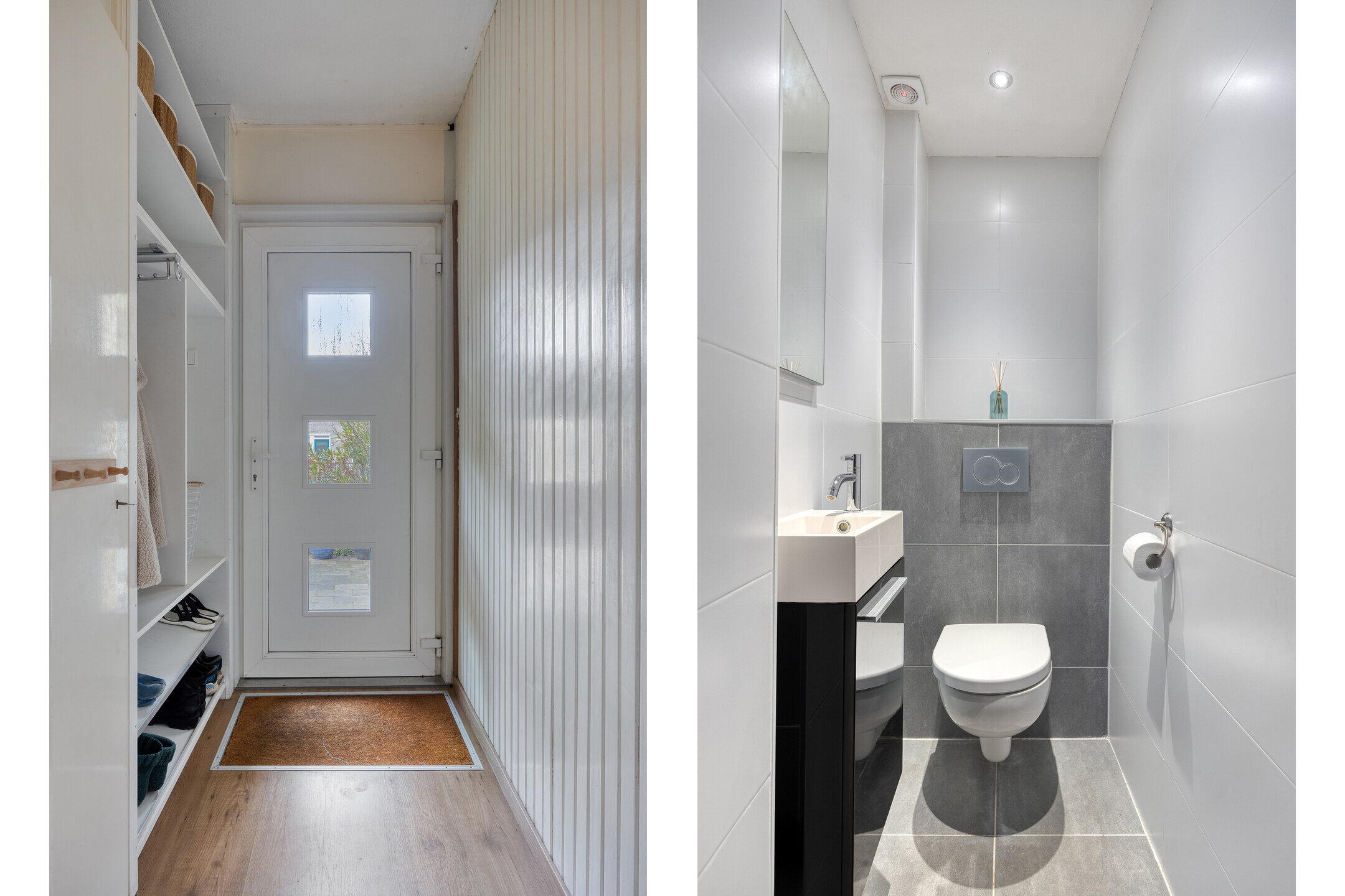 Begane grond: via de overdekte entree kom je binnen in het tochtportaal met garderobe en meterkast. Vervolgens de hal met trap naar verdieping en het moderne toilet met hangend closet en fontein.